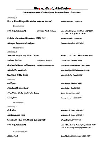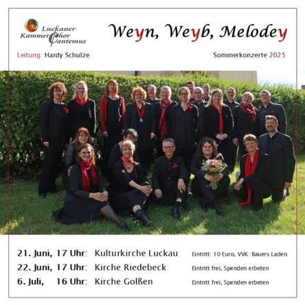 Freuen auch Sie sich auf die Sommerkonzerte 2025 des Luckauer Kammerchores Cantemus unter dem Motto: „Weyn, Weyb, Melodey“ mit Chormusik aus sechs Jahrhunderten.